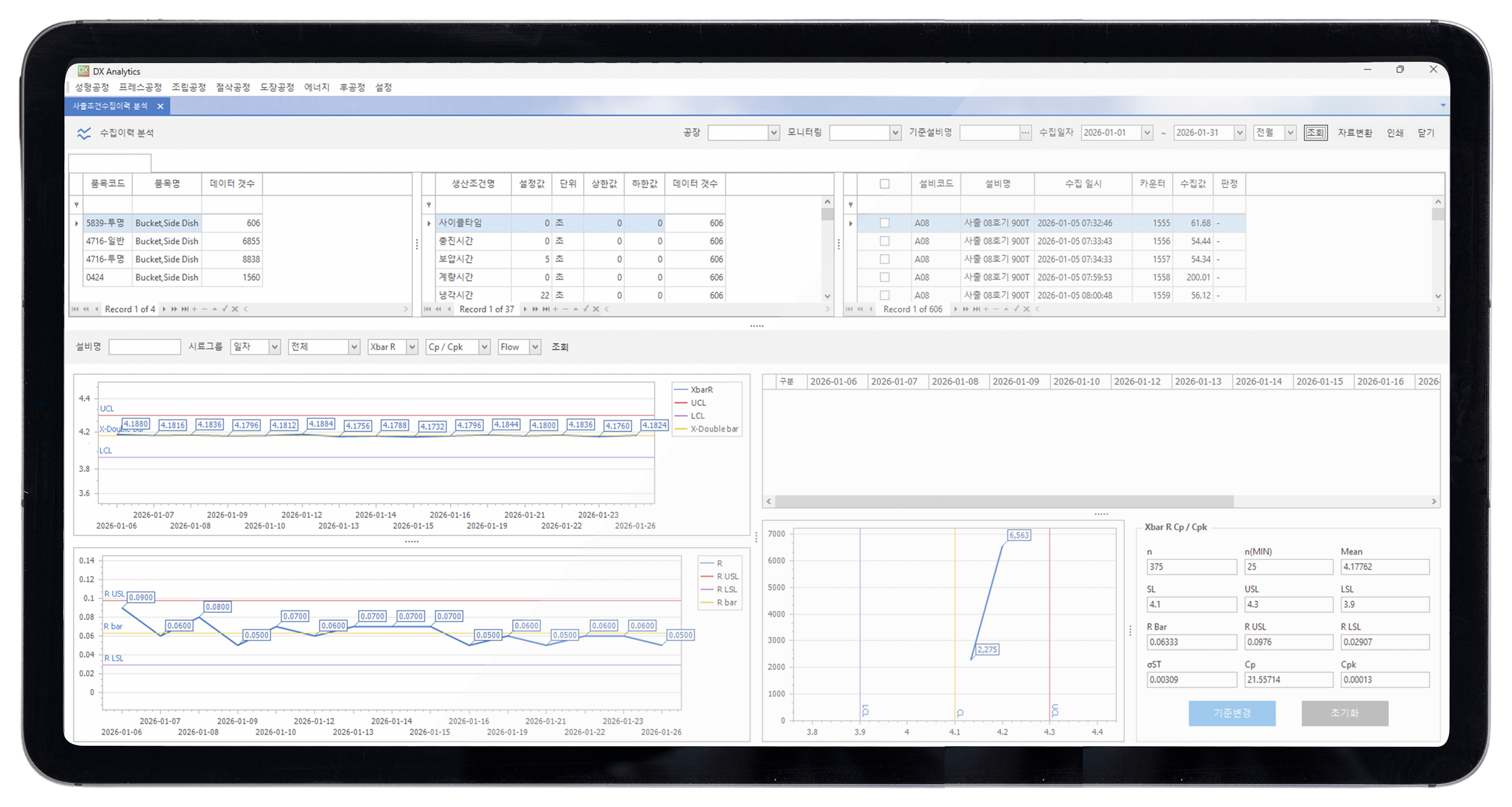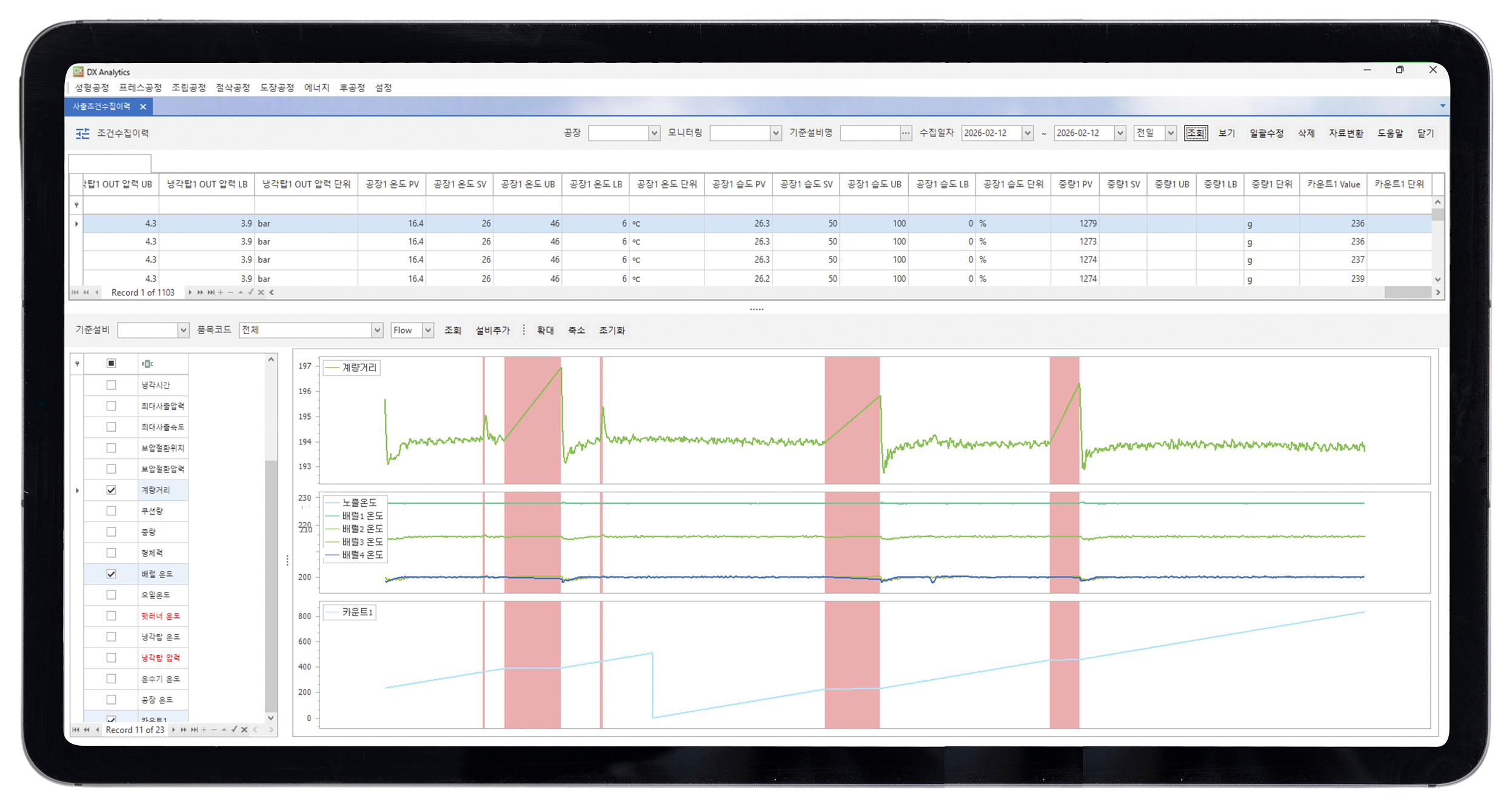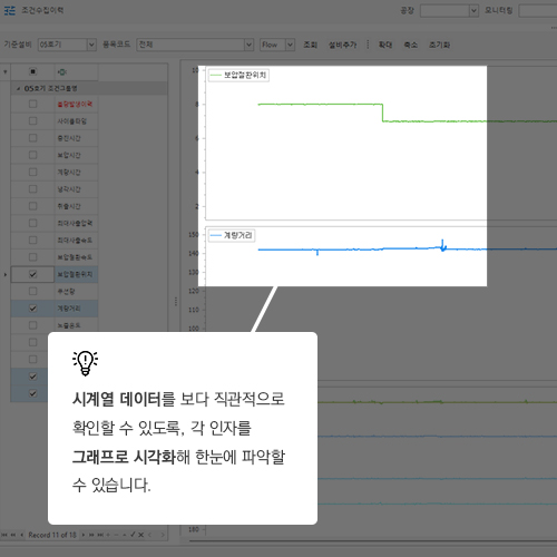 수집된 각 데이터의 조건을 기준으로 일자별로 나열하여 관계성 분석 및 불량 및 생산성 예측을 제공 한다.