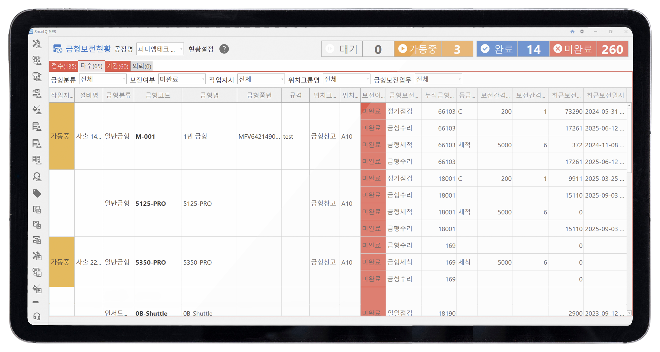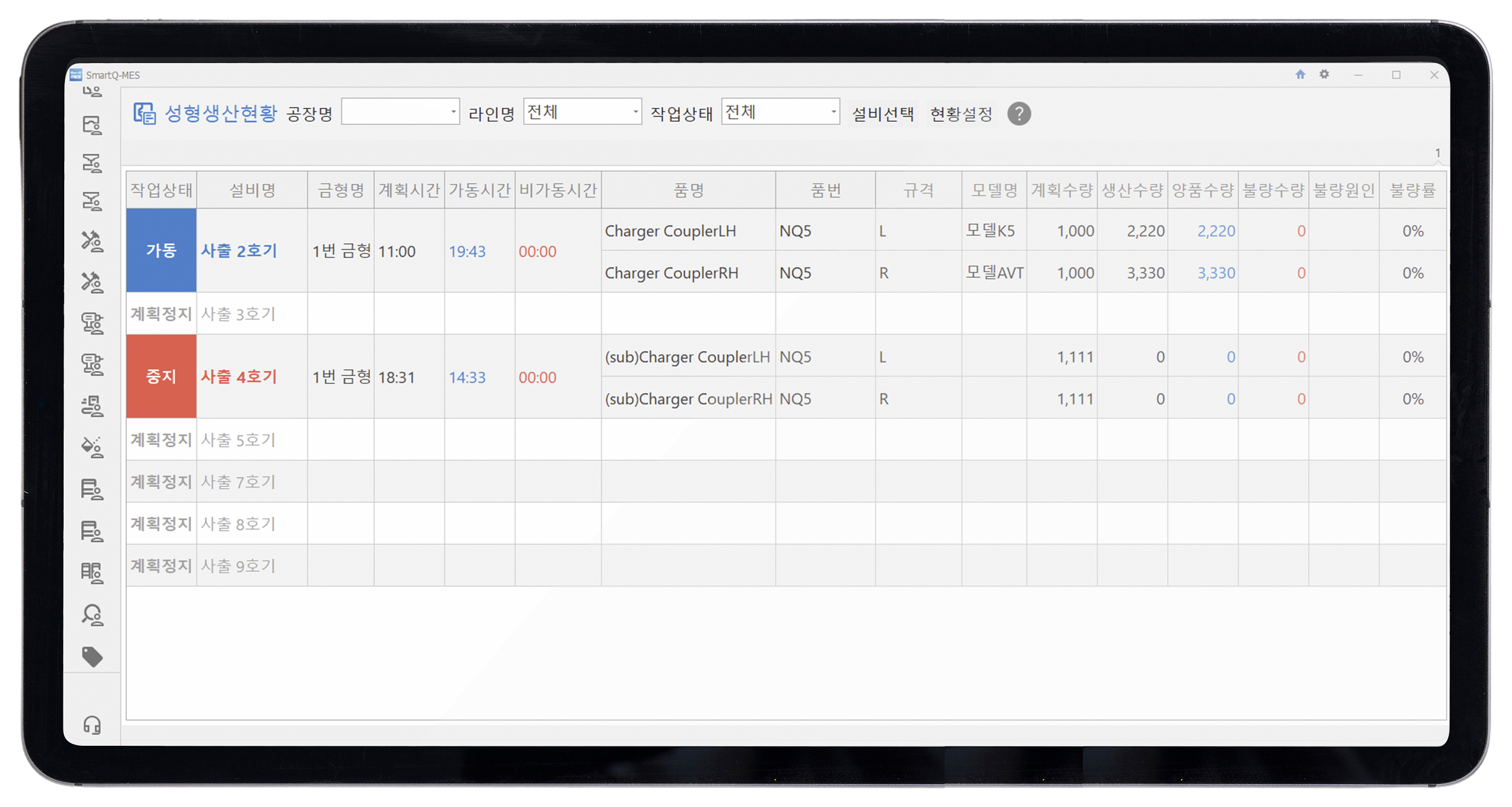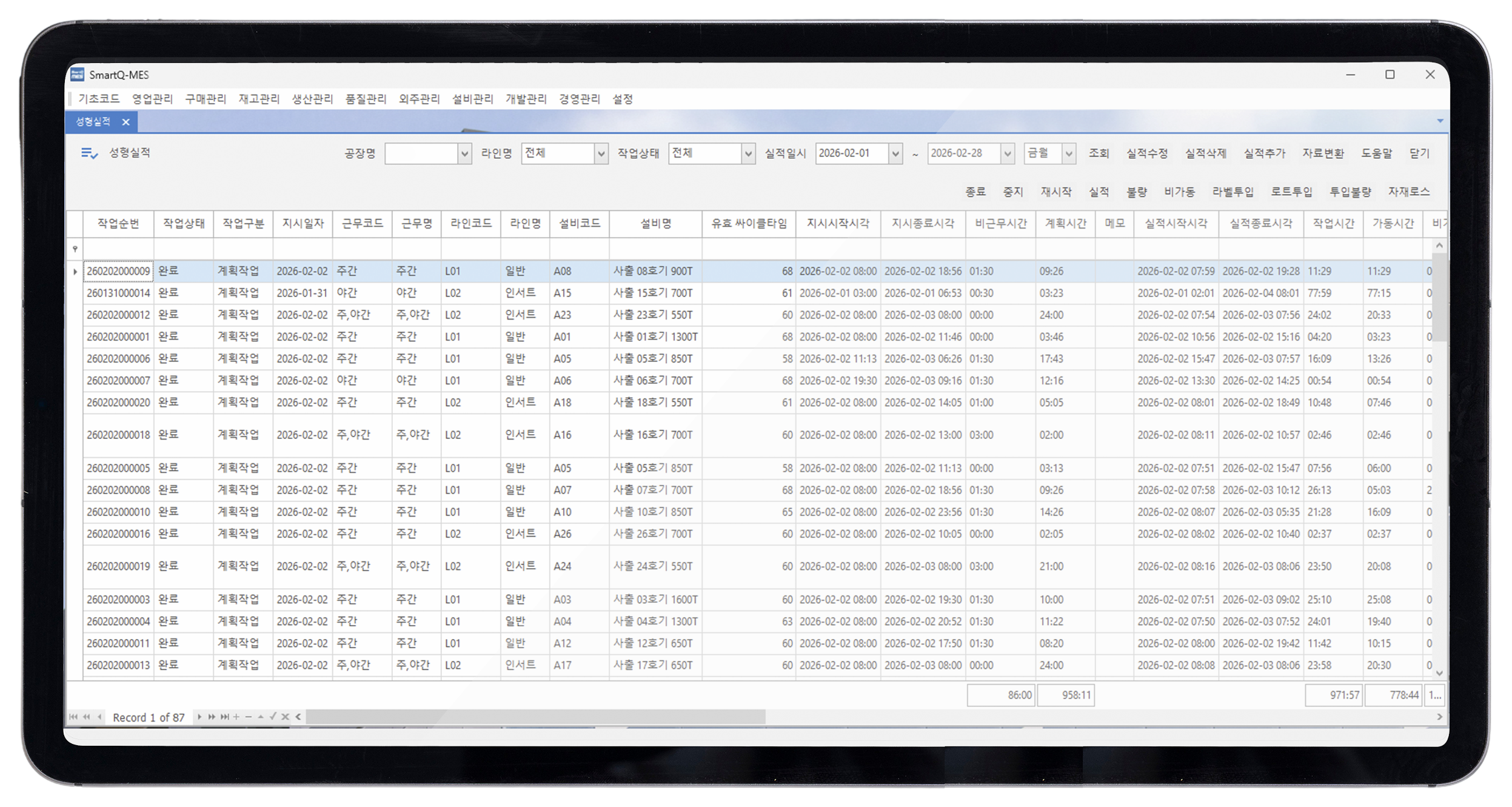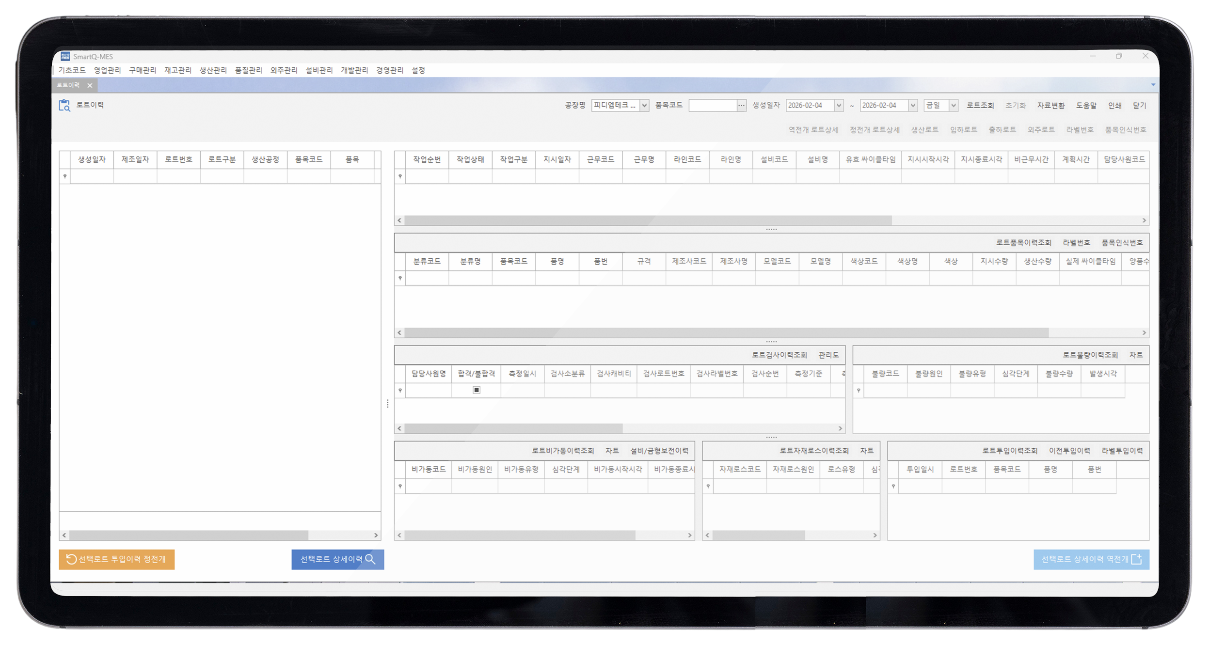 투입부터 공정 진행, 검사, 출하까지 전체 흐름을 실시간 확인할 수 있습니다. 특정 시점, 공정, 자재를 역추적하고 LOT 단위로 정확한 흐름 추적이 가능합니다.
